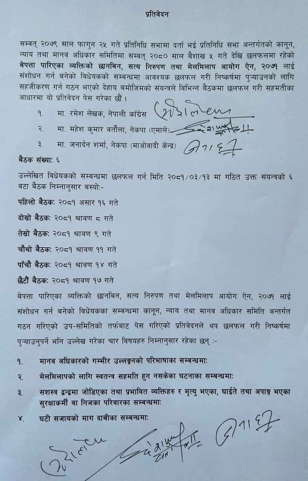 प्रतिनिधिसभामा दर्ता भई सभाको कानुन, न्याय तथा मानव अधिकार समितिमा विचाराधीन रहेका ती विधेयकका मुख्य सवालमा सहजीकरण र छलफल गरी निकालिएको निचोडको प्रतिवेदन बुझाइएको हो।