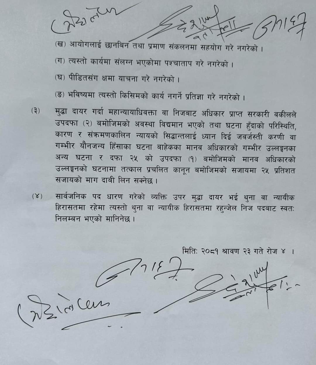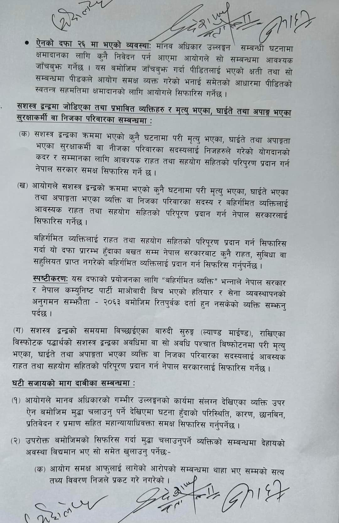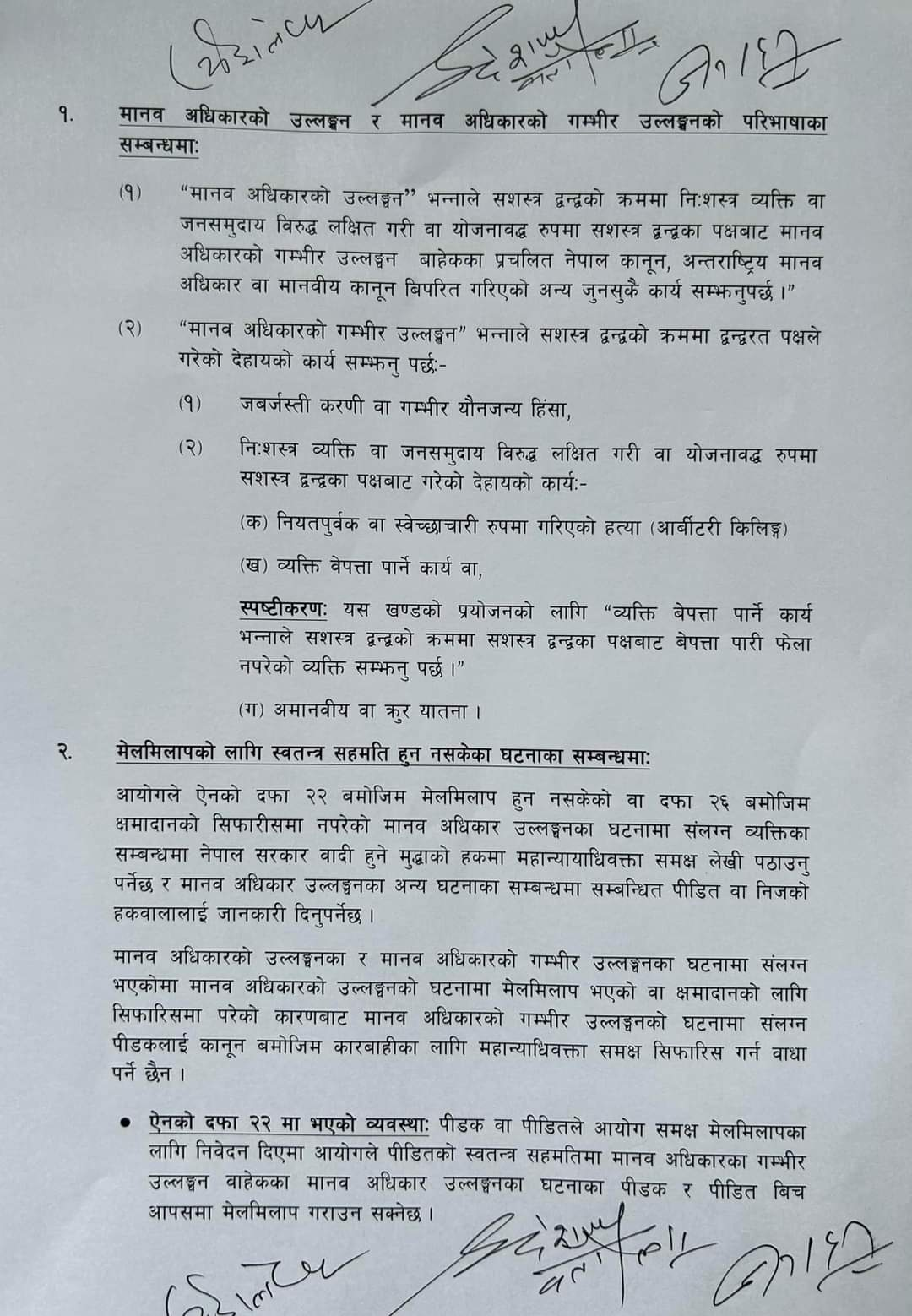 मानव अधिकारको गम्भीर उल्लंघनको परिभाषा, मेलमिलापको लागि स्वतन्त्र सहमति हुन नसकेका घटना, सशस्त्र द्वन्द्वताका मृतक, घाइते, अपाङ्गता भएका सुरक्षाकर्मी र निजका परिवार, घटी सजायको मागदाबीजस्ता विषयमा सहमति गरी कार्यदलले ४ पृष्ठको प्रतिवेदन तयार पारेको थियो।
