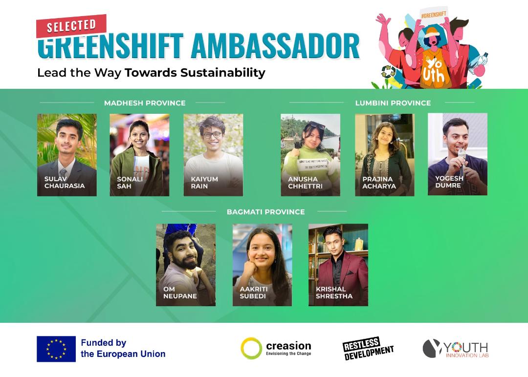 काठमाडौं, ३१ साउन । ईयूको सहयोगमा क्रिएसन नेपालले तीन प्रदेशका ९ जना युवाहरुलाई ‘ग्रीनसिफ्ट एम्बेस्डर’ का लागि छनौट गरेका छन् । ग्रीनसिफ्ट परियोजना अन्तर्गत वातावरण संरक्षण प्रति युवाहरुलाई सचेतना जगाउनका लागि ‘ग्रीनसिफ्ट एम्बेस्डर’ छनौट गरिएको हो ।