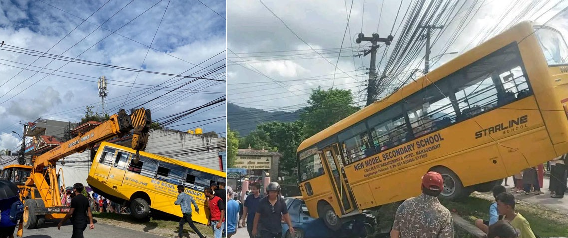 काठमाडौं ७ भदौं । पोखरा महानगरपालिका–१७ मा स्कुलबस दुर्घटनामा परेको छ। न्यू मोडेल सेकेन्डरी स्कुलको बस शुक्रबार दिउँसो दुर्घटनामा परेको हो।