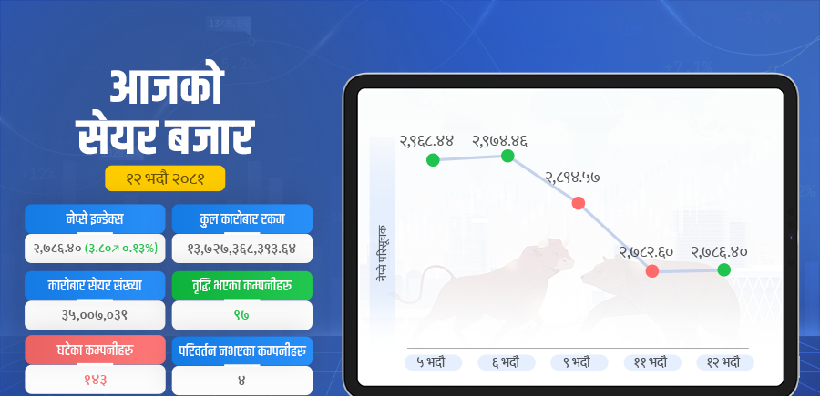 पिपुल्स हाइड्रोपावरको ९, थ्रीस्टार हाइड्रोपावरको ७।७, एचआईडीसीएलको ५।६ प्रतिशत मूल्य बढ्यो । कर्णाली विकास बैंकको ६।८, स्वरोजगार लघुवित्तको ५।१, अपरसोलु हाइड्रोको ५।१ तथा मल्टिपर्पस फाइनान्सको ४।९ प्रतिशत मूल्य घट्यो ।