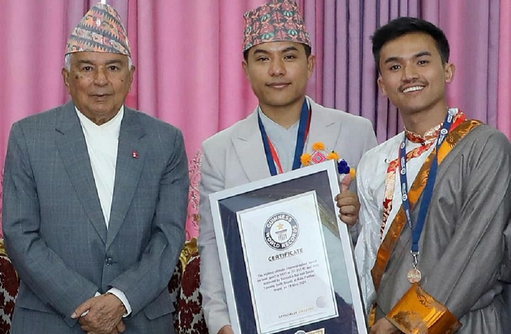 काठमाडौं ३० भदौ । राष्ट्रपति रामचन्द्र पौडेलले सुरेन्द्र राई र सुसन तामाङलाई गिनिज वर्ल्ड रेकर्ड्सको प्रमाणपत्र प्रदान गरेका छन्। सुरेन्द्र र सुसनले विश्वमै पहिलोपटक उच्चतम स्थानमा डान्स कोरियोग्राफी गर्दै ‘गिनिज बुक अफ वर्ल्ड रेकर्ड्स’ मा आफ्नो नाम दर्ज गरेका हुन्।