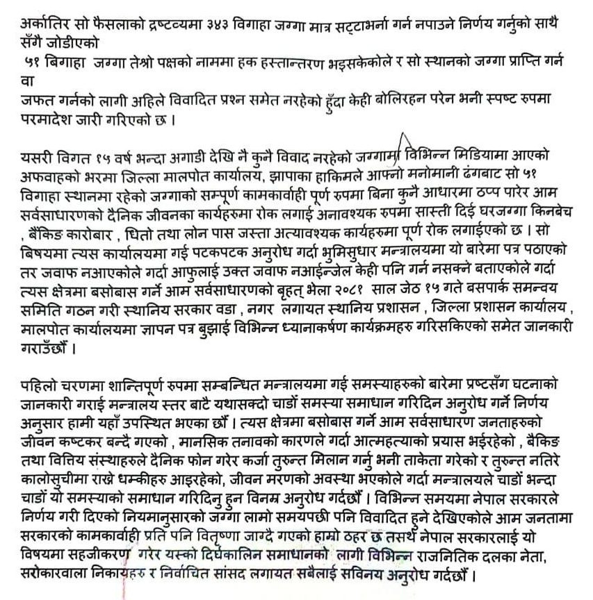 प्रशिक्षण तथा पार्टी प्रवेश कार्यकमका लागि झापा पुगेका अध्यक्ष प्रचण्डलाई स्थानीयले गिरिबन्धु टी स्टेटको ५१ बिघा जग्गाको विषयमा ज्ञापनपत्र बुझाएका हुन्।