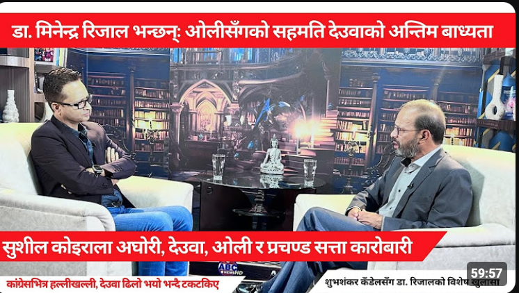 काठमाडौं ३१ भदौं । नेपाली कांग्रेसका नेता डा.मिनेन्द्र रिजालले आफ्नै दलका सभापतिलाई सत्ता कारोवारीको गम्भीर आरोप लगाएका छन् । चालु राजनीति विगतको राजनीतिक नेतृत्वको तुलना गर्दै डा. रिजालले भने – अहिलेका नेताहरु देउवा, ओली र प्रचण्ड सत्ता कारोवारी देखिएका छन् । विगतको नेतृत्वसँग उनीहरुको तुलना अवस्था नरहेको रिजालको भनाई थियो । एबीसी टेलिभिजनका साप्ताहिक कार्यक्रम आउटलुकका लागि प्रधानसम्पादक शुभशंकर कँडेलसँग कुरा गर्दै डा. रिजालले संविधान निर्माण ताकाका प्रधानमन्त्री तथा तत्कालीन पार्टी सभापति शुशील कोइरालालाई अघोरी नेताको उपमा दिएका छन् । कोइरालाको अघोरीपनकै कारण त्यो बेला संविधान बन्न सकेको डा. रिजालको बुझाई छ । समसामयिक अवस्था, संविधानसंशोधनको बेमौसी बाजा र ओली– देउवा गठबन्धनका बारे डा. रिजालले खुलेर कुरा गरेका छन् । यो अन्तर्वार्ता एबीसी टेलिभिजनमा शनिबार राती प्रसारण भएको थियो । बहुचर्चित यो अन्तर्वार्ताको लिंक यहाँ रहेको छ ।
