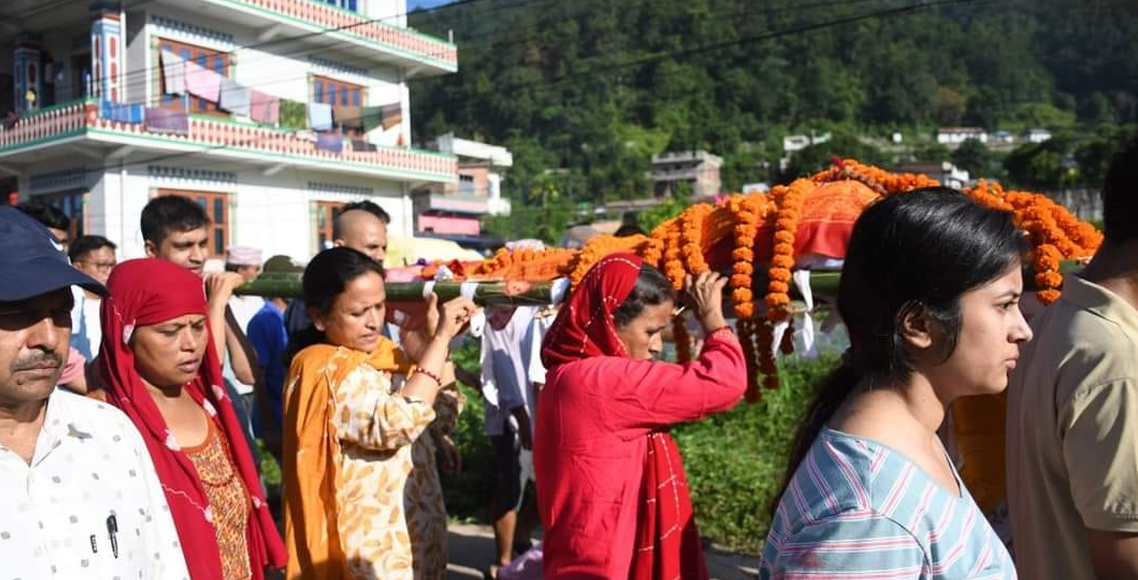 छोरी रेखा र छोरा अञ्जन दुवैले बुवाको शवलाई काँधमा हालेर खोला किनारसम्म पुर्याएका थिए।
