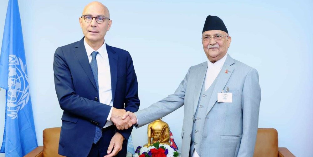 काठमाडौं ७ असोज ।     संयुक्त राष्ट्रसङ्घको ७९औँ महासभामा नेपाली प्रतिधिमण्डलको नेतृत्व गर्दै संयुक्त राज्य अमेरिकाको न्युयोर्कमा रहनुभएका प्रधानमन्त्री केपी शर्मा ओेलीसँग राष्ट्रसङ्घका मानव अधिकार उच्चायुक्त भोल्कर टर्कले आज शिष्टाचार भेट गर्नुभएको छ ।