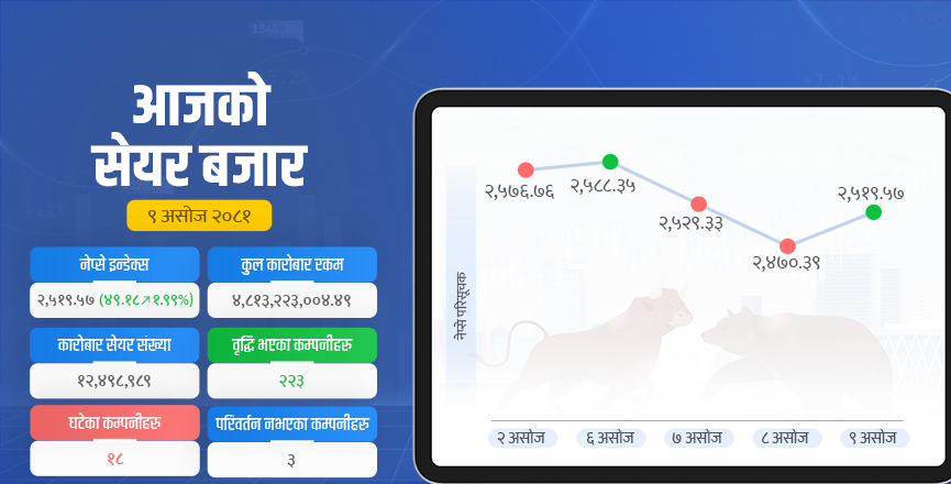 काठमाडौं ९ असोज । बुधबार सेयर बजारको परिसूचक नेप्से ४९। १८अंक बढेको छ । सो अंकको वृद्धिपछि नेप्से २५१९ अंकमा कायम भएको छ । बजार बढ्दा कारोबार रकम भने घटेको छ ।