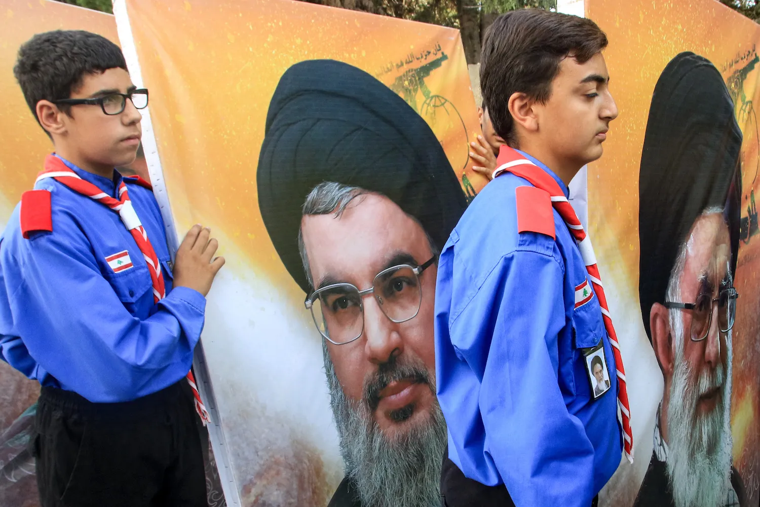 युवाहरूले इरानका सर्वोच्च नेता आयातोल्लाह अली खामेनी र हेजबुल्लाहका नेता हसन नस्रल्लाहलाई चित्रण गर्ने ठुला चित्रहरू लिएर मार्च गर्छन्।