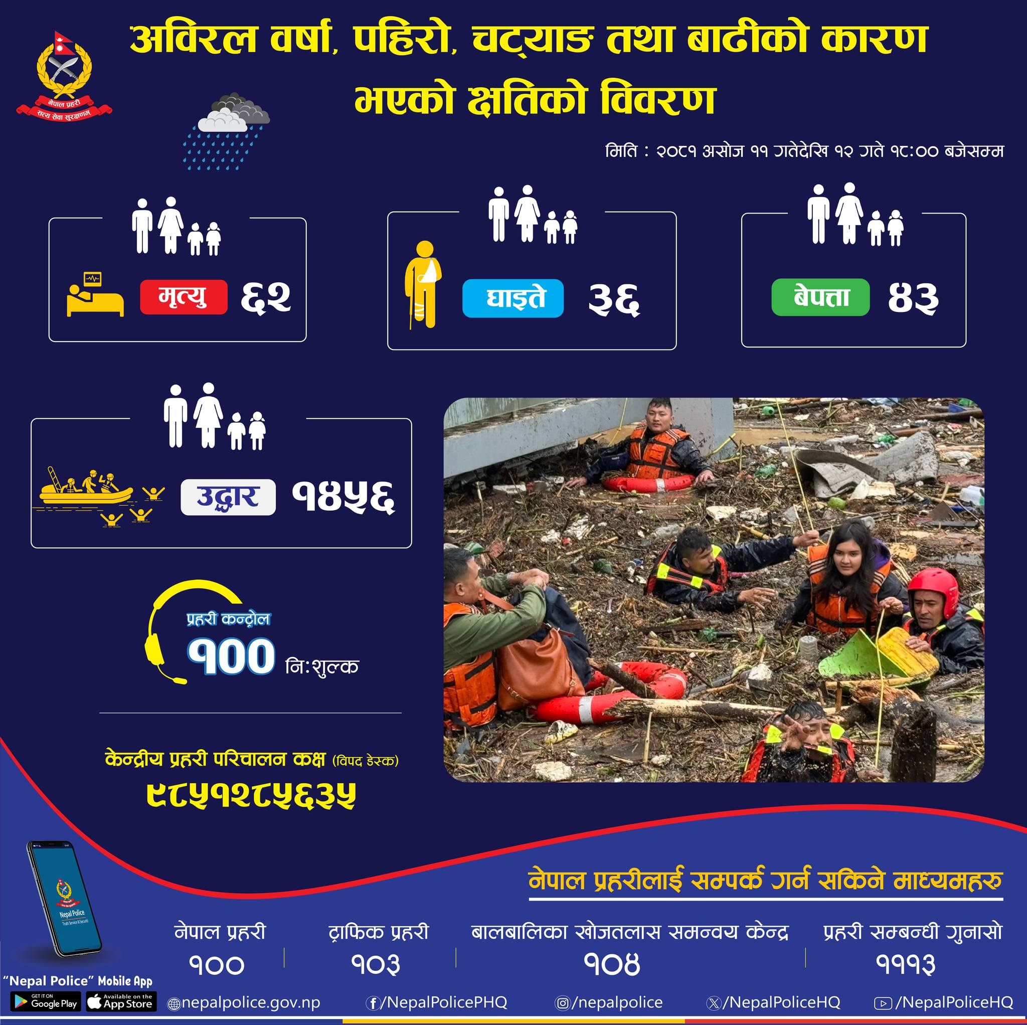 प्रहरी प्रधान कार्यालयका अनुसार, असोज ११ गतेदेखि आज १२ गते ८ बजेसम्ममा ६२ जनाको मृत्यु भएको छ । अविरल वर्षासँगै बाढी पहिरो, चट्याङमा परी ६२ जनाको मृत्यु भएको हो ।