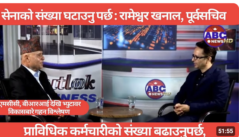 काठमाडौं १३ असोज । नेपाल सरकारका पूर्व सचिव तथा अर्थशास्त्री रामेश्वर खनालले राज्यसंयन्त्रलाई चुस्त बनाउन यति ठूलो नेपाली सेनाको संख्या घटाउनु पर्ने बताएका छन् । खनालले एबीसी टेलिभिजनको कार्यक्रम आउटलुक विजनेशका लागि प्रधानसम्पादक शुभशंकर कँडेलसँग कुरा गर्दै जनतालाई सेवा दिन तलसम्म पुग्नेगरी प्राविधिक जनशक्ति बढाउनु पर्ने बताएका छन् ।