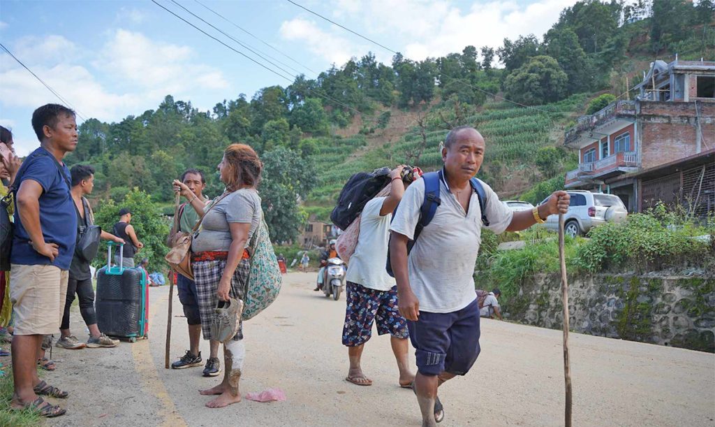 गह्रुंगो झोला र सामानका भारी बोकेका उनीहरु अधिकांश लठ्ठी टेकेर फर्किरहेका छन् । कतै खोला तर्नुपर्ने र हिलोमा समेत हिँड्नुपर्ने हुनाले उनीहरुका जुत्ताचप्पल भिजेका छन्, त्यसले खुट्टामा घाउ बनाएको छ । कसैले हिलो टाँसिएका जुत्ता र चप्पल हातमै बोकेका छन् । खाली खुट्टा पिच रोडमा हिँडिरहेका उनीहरु सुरक्षित ठाउँमा पुग्ने हतारमा छन् ।