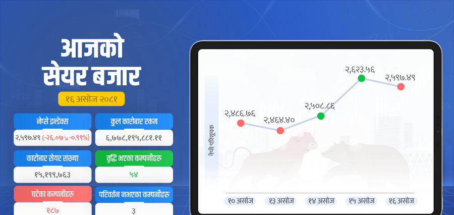 ५४ कम्पनीको मूल्य बढ्दा १८७ को घट्यो भने ३ को स्थिर रह्यो । फाइनान्सबाहेकका सबै क्षेत्रगत सूचक घटेका छन् । फाइनान्स १।७५ प्रतिशत बढ्यो । बैंकिङ ०।७१, विकास बैंक १।३८, होटल तथा पर्यटन १।७९, हाइड्रोपावर १।७४, लगानी १।५२, जीवन बीमा ०।४०, उत्पादन १।७९, माइक्रोफाइनान्स १।१२, निर्जीवन बीमा १।८२, व्यापार १।१८ प्रतिशत घटे ।
