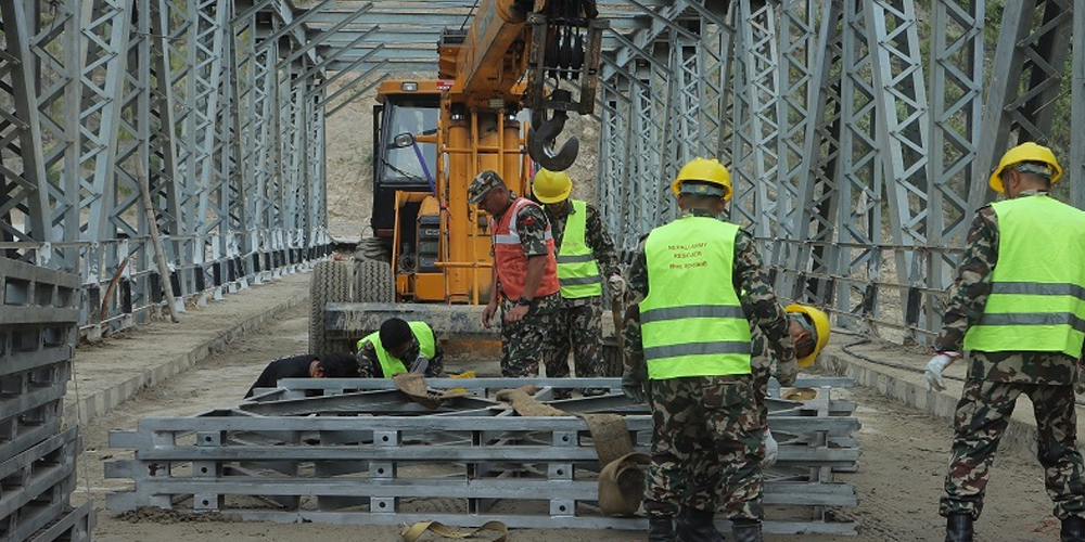 काठमाडौं । नेपाली सेनाले बाढीले बगाएको सिन्धुली–रामेछाप जोड्ने सुनकोशी नदीको पुलमा बेलिब्रिज हाल्न सुरु गरेको छ ।