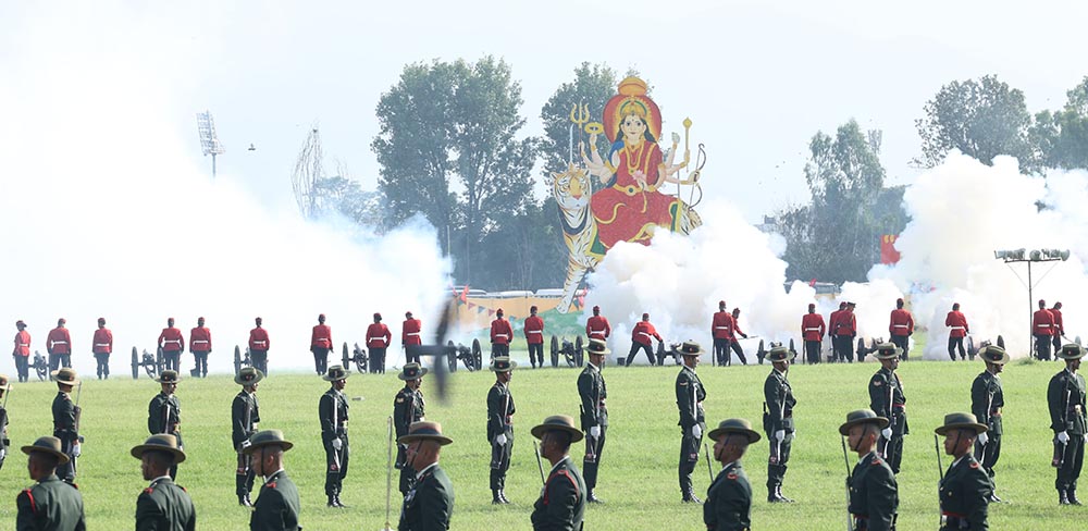 काठमाडौ २४ असोज । राष्ट्रपति रामचन्द्र पौडेलको प्रमुख आतिथ्यमा सैनिक मञ्च टुँडिखेलमा अपराह्न ‘फूलपाती बढाइँ समारोह–२०८१’ सम्पन्न गरिएको छ। समारोहमा नेपाली सेनाका परमाधिपति राष्ट्रपति पौडेलको सम्मानमा नेपाली सेनाले सलामी अर्पण गरेको थियो।