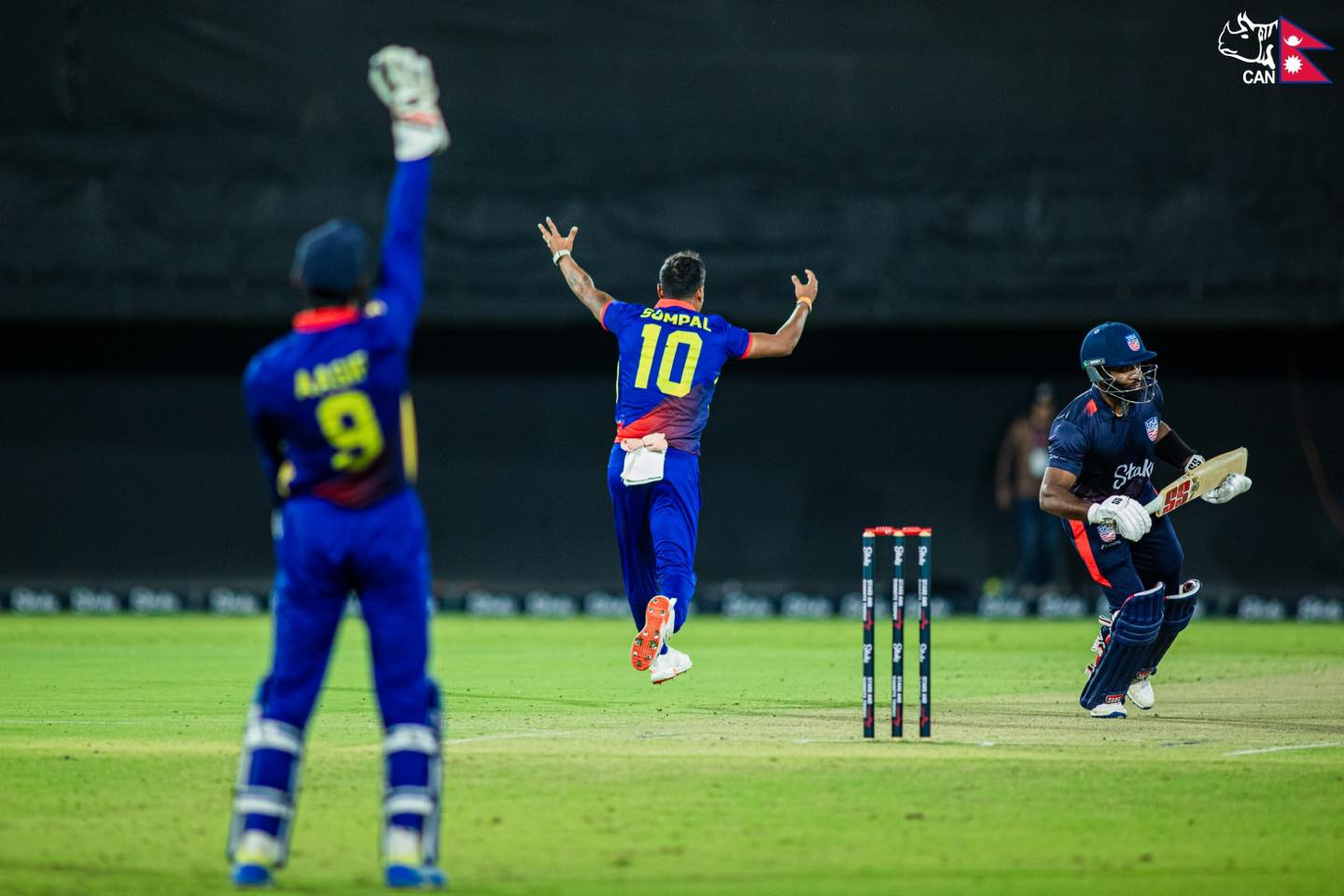 नेपालका लागि कुशल भुर्तेलले ५४ बलमा ९२ रनको अर्धशतकीय पारी खेल्दा अनिल साहले २५, गुल्सन झाले १९ तथा रोहित पौडेलले १८ रनको योगदान गरे। अमेरिकाका लागि नोस्थुस केन्जिगे र जसदीप सिंहले २–२ विकेट लिँदा सौरभ नेत्रभाल्करले १ विकेट लिए।