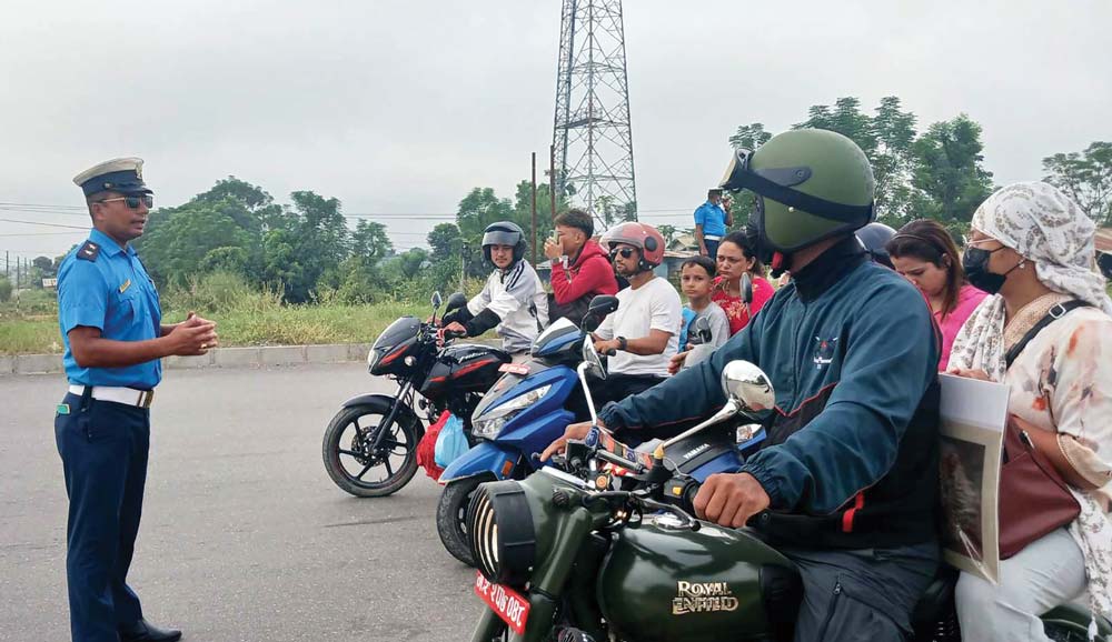 जिल्ला ट्राफिक कार्यालय नवलपुरका प्रमुख, प्रहरी निरीक्षक जनकराज बन्जाराले बढी भाडा लिने, छतमा यात्रु राख्ने, झुन्डिएर यात्रा गर्ने, मोटरसाइकलमा तीन जना चढ्ने, बिनाहेलमेट हिँड्ने, नियमविपरीत सञ्चालित सवारीसाधन चालकलाई कारबाही गरिएको बताउनुभयो ।