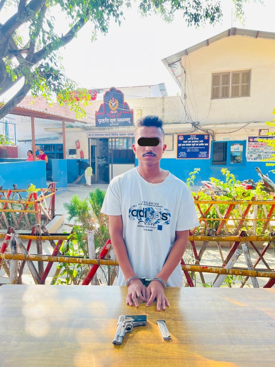 पक्राउ परेका अभियुक्तमा दैलेख घर भई रानीवन बस्दै आएका २५ वर्षीय अनिल खड्का छन् । उनको साथबाट अटो पेस्तोल र म्यागेजिन बरामद भएको काठमाडौं प्रहरीले जानकारी दिएको छ ।