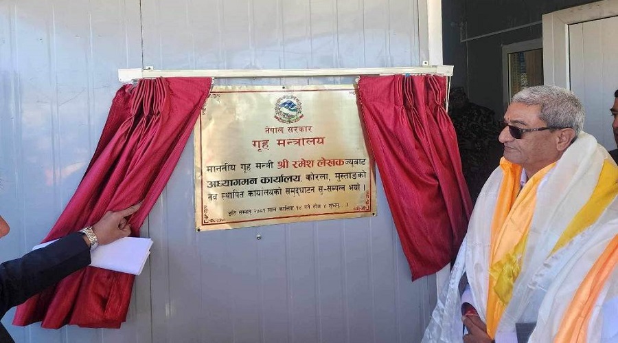काठमाडौं १४ कात्तिक । गृहमन्त्री रमेश लेखकले उपल्लो मुस्ताङको कोरला नाकामा स्थापना गरिएको अध्यागमन कार्यालयको बुधबार उद्घाटन गर्नुभएको छ ।