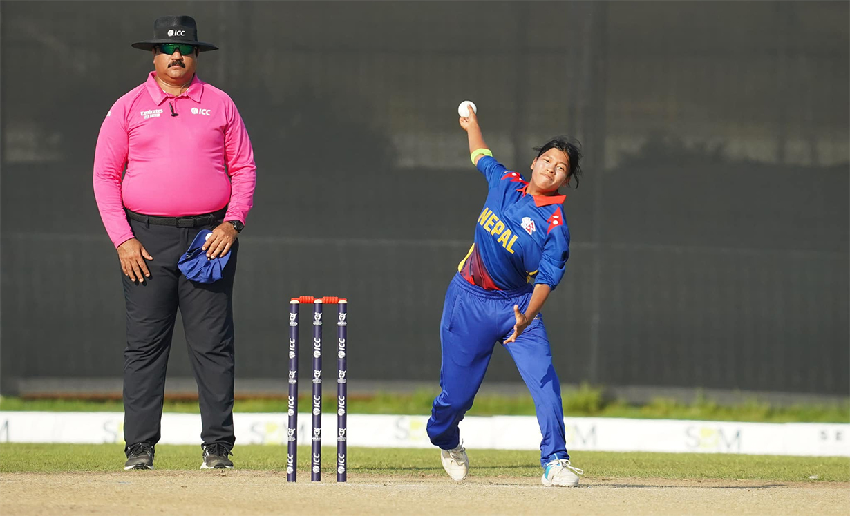 नेपालका लागि कृष्मा गुरुङले ४ ओभरमा १७ रन दिएर ४ विकेट लिइन् । उनले कप्तान धर्निधरका सहित खेलाडीलाई एकै ओभरमा आउट गराएकी थिइन् । नेपालका रिया शर्मा र सीमा केसीले २(२ विकेट लिँदा रचना कुमारी चौधरीले १ विकेट लिइन् ।