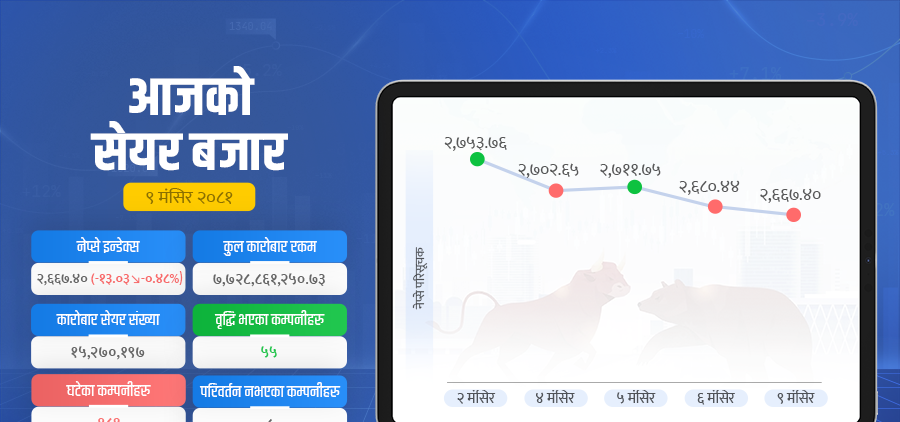 काठमाडौं ९ मंसिर । साताको पहिलो दिन आइतबार सेयर बजार २६६७ अंकमा झरेको छ । अघिल्लो दिनको तुलनामा नेप्से परिसूचक १३।०३ अंक घटेको हो । कारोबार रकम पनि घटेको छ । अघिल्लो दिन ८ अर्ब २५ करोडको कारोबार भएकोमा यस दिन ७ अर्ब ७२ करोडको भयो ।