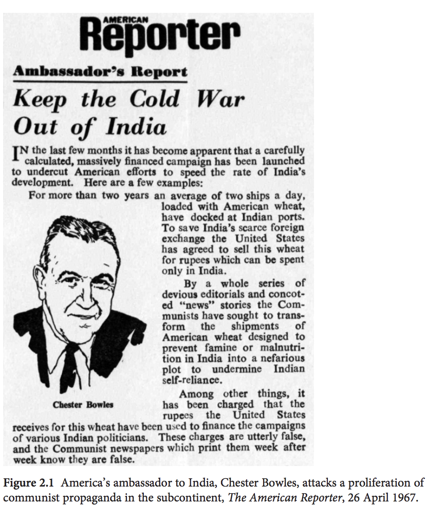 १९६० को दशकको अन्त्यमा, अमेरिका सिनो–इन्डियन युद्धको विषयलाई लिएर भारतसँग तनावमा थियो । यस बीचमा, सोभियत संघले भारतमा प्रचार तथा भ्रामक जानकारी फैलाउने अभियान सञ्चालन ग¥यो, भने अमेरिका र बेलायतले भारतलाई कम्युनिज्मलाई रोक्न केन्द्रित गरे । भारतलाई चीनको विरोधमा चासो थियो, जबकि पश्चिमी देशहरूको ध्यान कम्युनिस्ट विचारधारा नियन्त्रणमा सीमित रह्यो ।
