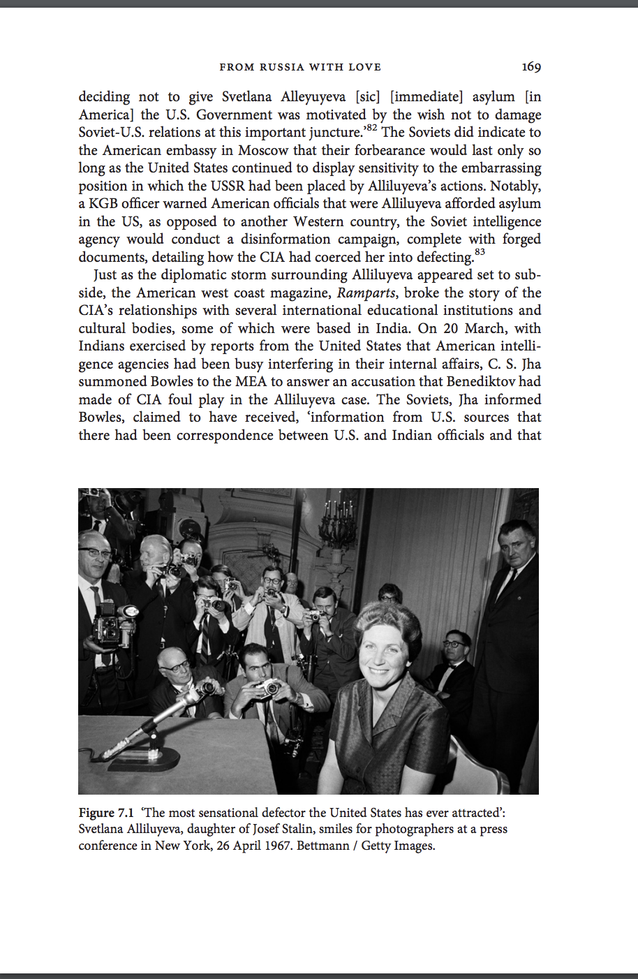 १९६७ मा, सोभियत नेता जोसेफ स्टालिनकी छोरी स्वेतलाना अलीलुइएभाले आफ्ना सुरक्षा अधिकारीहरूलाई छल्दै अमेरिकी दूतावासमा प्रवेश गरेको घटनालाई विशेष रुपमा लेखिएको छ । उनले मस्कोमा भेटेका भारतीय कम्युनिस्ट कुटनीतिज्ञ प्रेमीसँग विवाह नगरे पनि, उनी उनको निधनपछि भारत आएकी थिइन् । प्रेमीको अस्तु भारतमा विसर्जन गरेपछि, उनले सोभियत कम्युनिज्मप्रति निराशा व्यक्त गर्दै भारतमै बस्ने अनुमति मागिन् ।् तर, उनको अनुमति अस्वीकृत भएपछि, उनले तत्काल अमेरिका जाने निर्णय गरिन् ।