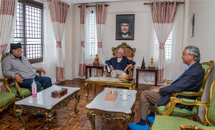 प्रधानमन्त्री ओलीले विहीबार बेलुकी कांग्रेस सभापति शेरबहादुर देउवा र माओवादी केन्द्रका अध्यक्ष पुष्पकमल दाहाल प्रचण्डसँग संयुक्त छलफल गरेका हुन् । छलफल सत्य निरुपण तथा मेलमिलाप आयोग र वेपत्ता छानबिन आयोगको पदाधिकारी चयनका विषयमा केन्द्रित थियो । तर छलफलमा ठोस सहमति नभएको स्रोतले बतायो ।