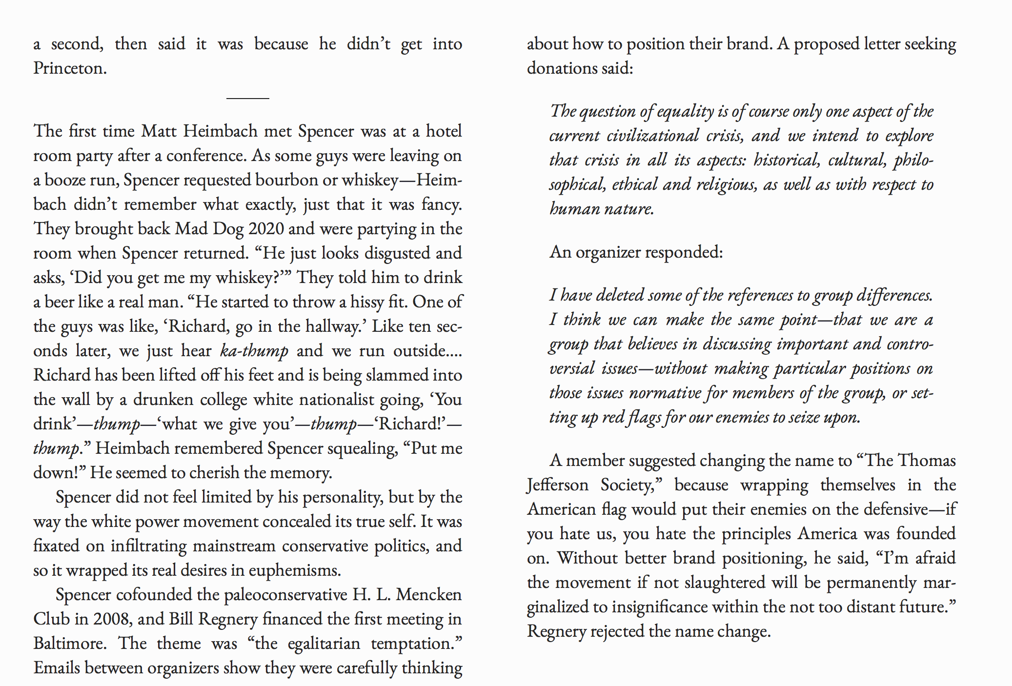 तर अहिलेका लागि, रीभले महत्वपूर्ण योगदान गरेकी छन् । उनले पाठकहरूलाई चार्लोट्सभिलमा दक्षिणपन्थीहरूका साथ उभ्याएकी छन्, एक गाढा ट्रकको पछाडि उनीहरुसँगै राखेकी छन्, र हतियारहरू ओछ्यानमा जथाभावी फ्याँकिएको होटलको कोठामा लिएर गएकी छन्। एल रीभ साहसी छन्, र उनले साहसी पुस्तक लेखेकी छन् ।