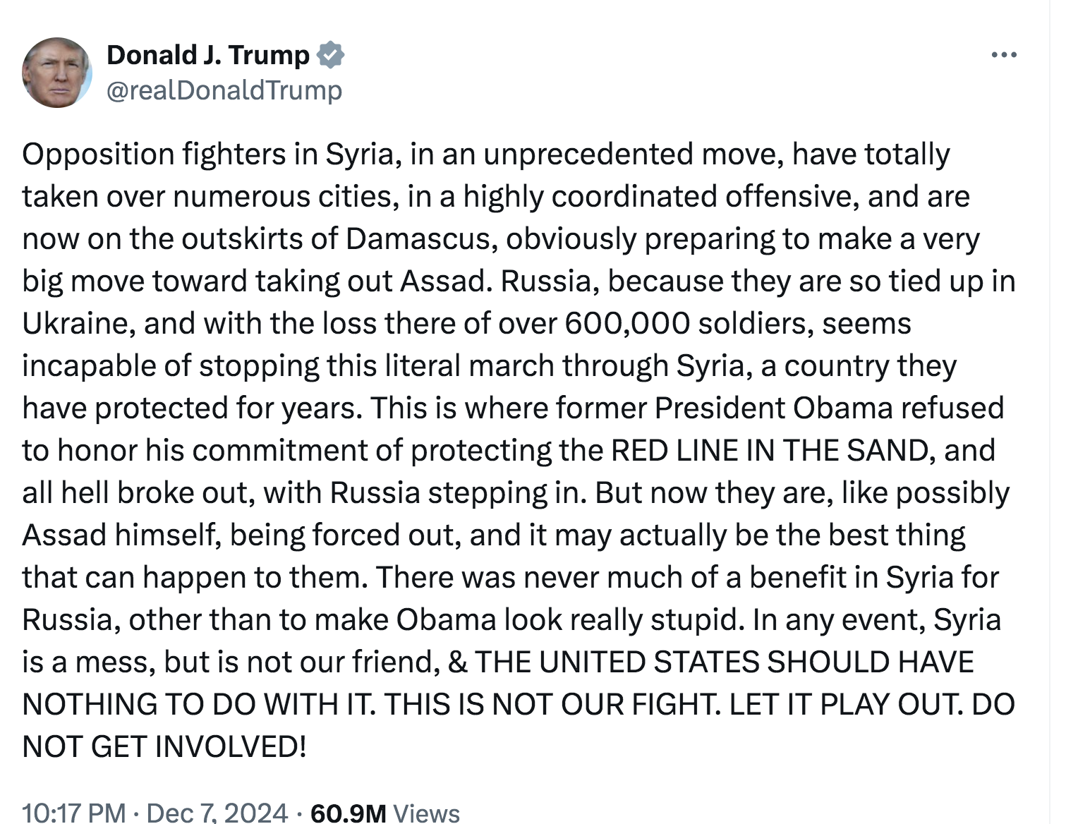बश अल असददको शासनको यति चाँडो पतनले सिरियालीहरूलाई झस्काएको छ – यद्यपि केही दिनदेखि यो अपरिहार्य जस्तै देखिएको थियो। असदका विदेशी सहयोगीहरूले पनि न्यूनतम मात्रामा मात्र सहयोग गरेका थिए । रसियाले उत्तरी सिरियामा केही छिटफुट हवाई आक्रमण गर्यो, जबकि इरानले मिसाइल र ड्रोन पठाउने बताए पनि उल्लेखनीय पहल गरेन । तर, विद्रोहीहरूको आक्रमणलाई रोक्न असदलाई यो भन्दा धेरै सहयोग आवश्यक थियो। उनका सहयोगीहरूले पनि साथ छोडिदिए । डिसेम्बर ६ मा, दमास्कसस्थित रसियन दूतावासले आफ्ना नागरिकहरूलाई सकेसम्म चाँडै सिरिया छोड्न भनेको थियो। इरानले पनि केही सैन्य कर्मचारीलाई फिर्ता बोलाएको रिपोर्ट सार्वजनिक भएको छ ।