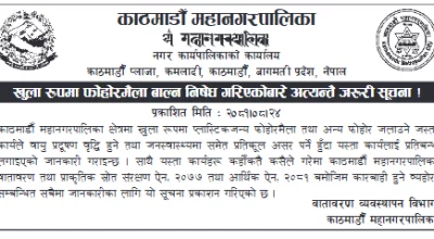 महानगरपालिकाले आज एक सूचना जारी गर्दै यदि कसैले खुला रूपमा फोहोरमैला बालेर वायु प्रदूषण गरे वातावरण तथा प्राकृतिक स्रोत संरक्षण ऐन तथा आर्थिक ऐन बमोजिम कारबाही हुने जनाइएको छ ।