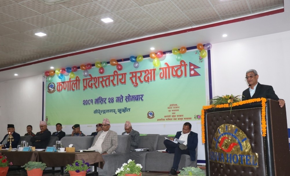 सोमबारबाट सुर्खेतको वीरेन्द्रनगरमा कर्णाली प्रदेशस्तरीय सुरक्षा गोष्ठी सुरू भएको छ । गोष्ठीमा सहभागी हुन गृहमन्त्री लेखकसँगै गृहसचिव गोकर्णमणी दुवाडी , तीनै तहका सुरक्षा निकायका प्रमुख सुर्खेत पुगेका छन् । गोष्ठीमा प्रदेशसँगै कर्णालीका १० वटै जिल्लाका सुरक्षा निकायका प्रमुखहरूको सहभागिता रहेको छ । गोष्ठीमा प्रदेशको शान्ति सुरक्षाको विषयमा छलफल हुने गृह मन्त्रालयका प्रशासन महाशाखा प्रमुख ऋृषिराम तिवारीले बताए । योसँगै प्रदेशको बढ्दो सवारी दुर्घटना र यसको न्यूनीकरणको उपायबारे पनि छलफल हुने जानकारी दिए । उनका अनुसार गोष्ठीमा अन्तर्राष्ट्रिय सीमास्तम्भको अनुगमन र सुरक्षा लगाएका विषयमा पनि छलफल हुने उनले बताए ।