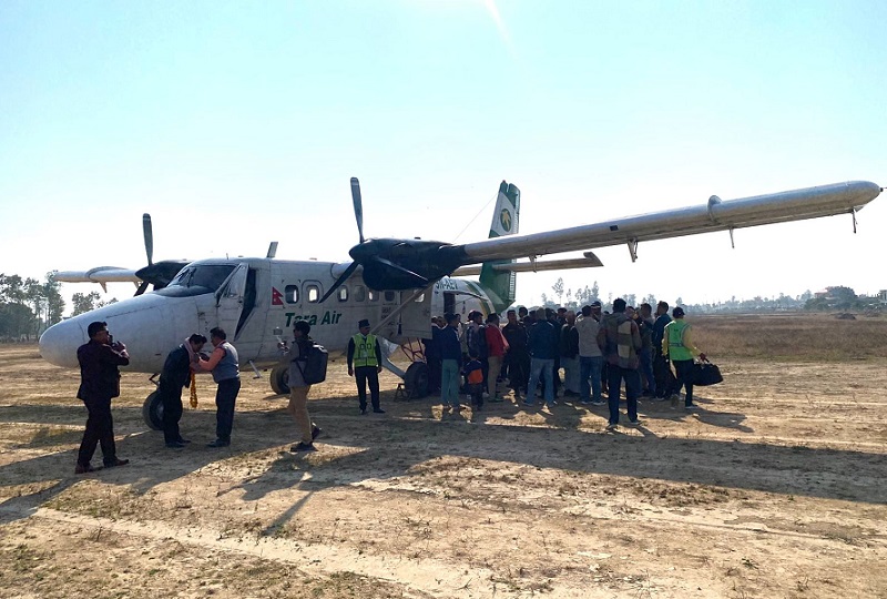 काठमाडौं ३० मंसिर । २७ वर्षदेखि बन्द अवस्थामा रहेको कैलालीको टीकापुर विमानस्थलमा आजदेखि उडान शुरु भएको छ । आज दिउँसो तारा एयरको वाइटी १७०१ नम्बरको ट्वीनअटर विमानमा चालक दलका तीनसहित छ कर्मचारी र १२ यात्रु टीकापुर विमानस्थलमा अवतरण गरेसँगै विमानस्थलमा उडान शुरु भएको हो ।