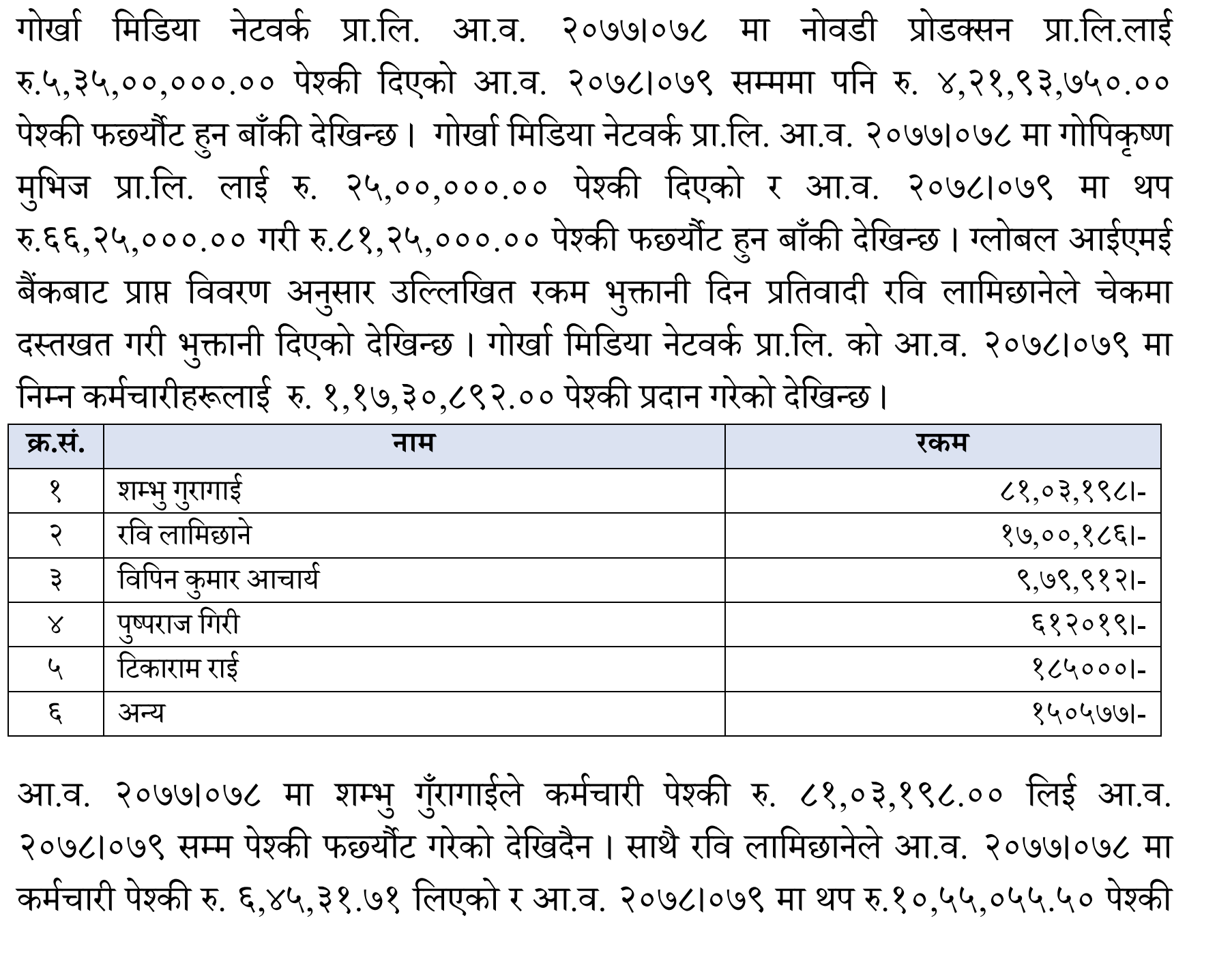 लामिछानेसहित पूर्वडीआईजी छविलाल जोशी, लिला पछाई, रामबहादुर खनाल र कृष्णबहादुर गुरूङविरूद्ध सहकारी ठगी, संगठित अपराध र सम्पत्ति शुद्धीकरणसम्बन्धी कसुरमा मुद्दा दर्ता भएको हो । कास्की जिल्ला अदालतका निमित्त श्रेस्तेदार ख्यामनारायण लामिछानेका अनुसार विभिन्न ८ वटा कम्पनीविरुद्ध पनि मुद्दा दर्ता भएको छ । त्यस्तै ५ जनाको सम्पत्ति जफत गर्नुपर्ने सरकारी वकिलको कार्यालयको राय छ । समग्रमा ४४ व्यक्ति र कम्पनीलाई प्रतिवादी बनाइएको निमित्त श्रेस्तेदार लामिछानेले बताए ।