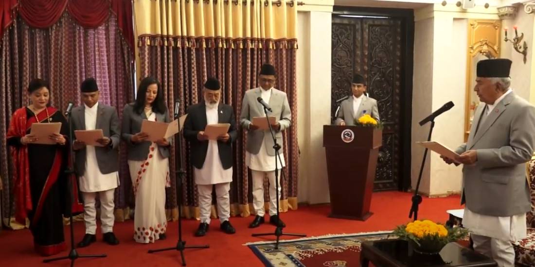 काठमाडौं । राष्ट्रपति रामचन्द्र पौडेलले विभिन्न पाँच देशका लागि नियुक्त भएका राजदूतहरूलाई पद तथा गोपनीयताको शपथ गराएका छन् ।