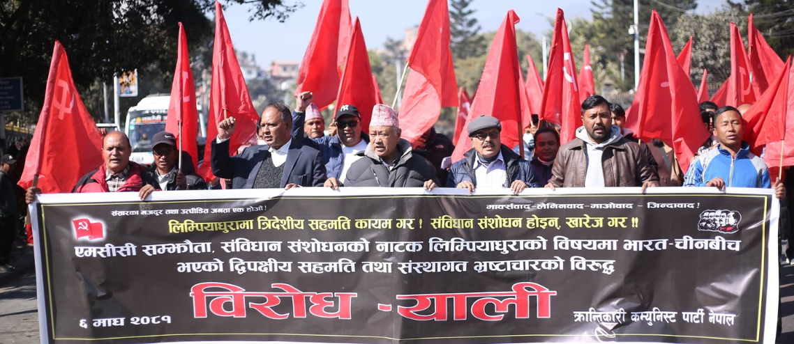 काठमाडौं ६ माघ । मोहन वैद्य नेतृत्वको क्रान्तिकारी कम्युनिष्ट पार्टीले विरोध र्याली निकालेको छ। आइतबार शान्ति बाटिकामा निकालिएको र्यालीमा लिम्पियाधुरामा भारत र चीन एक्लैले गरेको सहमति, अमेरिकी सहयोग परियोजना एमसीसी, संविधान संशोधन लगायतको विरोध गरिएको छ।