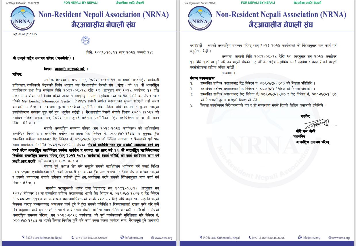 यस्तै पत्रमा, ‘माननीय परराष्ट्रमन्त्री आरजू राणा देउवाबाट सन् २०८१ । ०७ । २१ (तदनुसार सन् २०२४ नोभेम्बर ६) मा सम्मानित सर्वोच्च अदालतबाट भएको रिट निवेदन नं. ०७९ । WO । १५०७ र रिट निवेदन नं ०८० । WO । ११५७ का सम्बन्धमा महान्यायाधिवक्ताको कार्यालयबाट राय लिई अघि बढ्ने सम्म सहमति भएको विषयमा परराष्ट्र मन्त्रालयबाट आवश्यक कार्य हुने नै हुँदा संघको गतिविधि र निरन्तरतालाई खलल पुग्ने गरि कुनै पनि समूहबाट कार्य हुन नसक्ने र त्यस्तो कार्य भएमा संघले स्वामित्व समेत नलिने जानकारी गराउँदछौं’ उल्लेख छ।
