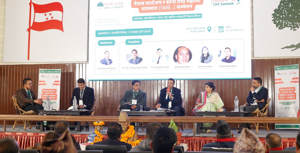 कांग्रेस केन्द्रीय पार्टी कार्यालय सानेपामा जारी नेपाल ‘स्टार्टअप’ र ‘एसएमई’ सम्मेलनको दोस्रो दिनको ‘उद्यमशीलता र जनशक्ति विकासः आईटी क्षेत्रको लागि तयारी’ शीर्षकको सत्रमा भएको छलफलका वक्ताहरुले आईटीमा थोरै लगानी गर्नसके राम्रो परिणाम हात पार्न सकिने बताएका हुन्।