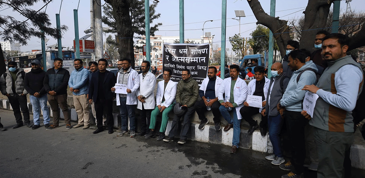 काठमाडौं, १८ माघ । सरकारीसरह पारिश्रमिक माग गर्दै आन्दोलनरत आवासीय चिकित्सकहरुले आज ‘पेन डाउन’ सहित विरोध प्रदर्शन गर्दैछन् ।‘स्वास्थ्यकर्मीका लागि सुरक्षित कार्यस्थल संघर्ष समिति’को नामबाट आन्दोलनरत आवासीय चिकित्सकहरुले आज बिहान ९ बजेदेखि १० बजेसम्म ‘पेन डाउन’ र आ–आफ्नो संस्थामा एप्रोनसहित प्रदर्शन गर्न लागेका हुन् । काठमाडौं उपत्यकाभित्र भने माइतीघर मण्डलामा समेत भेला भएर प्रदर्शन गर्ने कार्यक्रम छ ।
