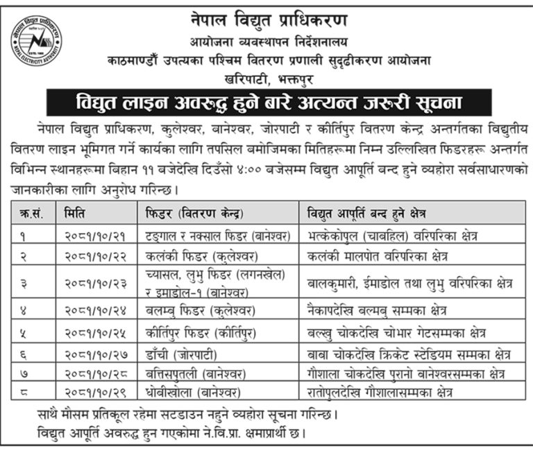प्राधिकरणले कुलेश्वर, बानेश्वर, जोरपाटी र कीर्तिपुर वितरण केन्द्र अन्तरगतका विद्युतीय लाइन भूमिगत गर्न लागेको छ । सोही अनुसार २९ गतेसम्म ती क्षेत्रमा बिहान ११ बजेदेखि अपराह्न ४ बजेसम्म विद्युत सेवा अवरुद्ध गर्न लागिएको हो ।