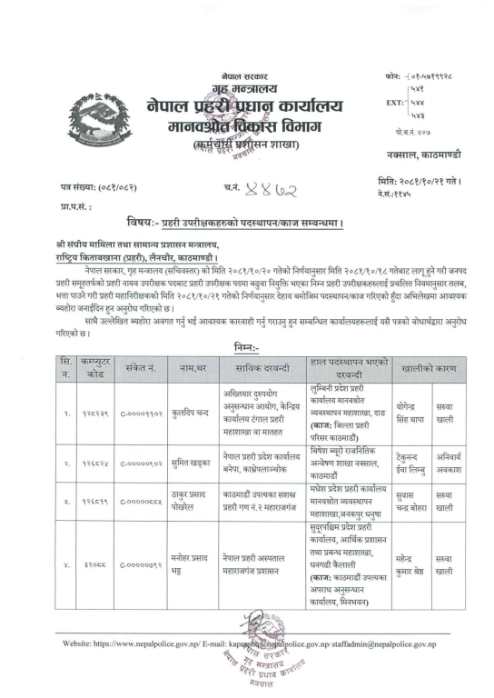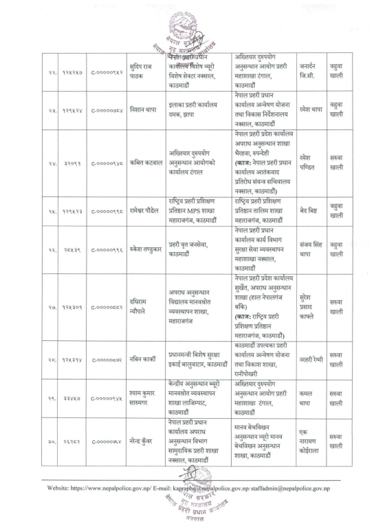 दीपक गिरी ट्राफिक प्रहरी कार्यालय, युवराज खड्का सीआईबी र नवीन कार्की काठमाडौँ उपत्यका प्रहरी कार्यालय रानीपोखरीमा पदस्थापन भएका छन्।
