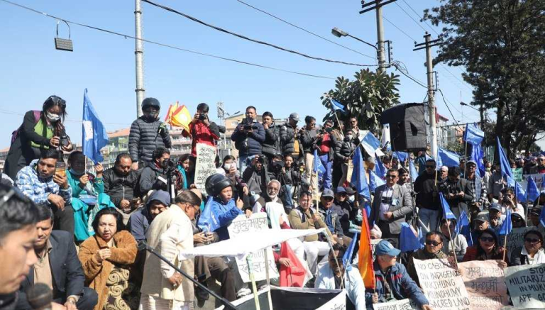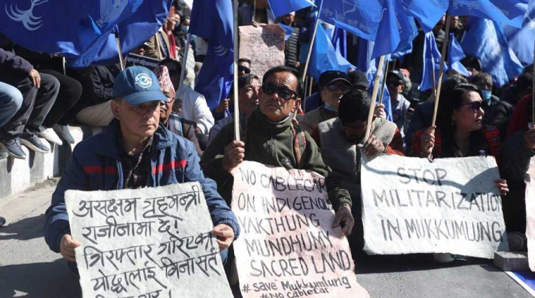 मुक्कुमलुङ ताड्सेःप चुम्भो र मक्कुमलुङ संरक्षण अन्तरदलीय संघर्ष समितिको आयोजनामा सोमबार काठमाडौँको माइतीघर मण्डलमा विरोध प्रदर्शन भएको हो।