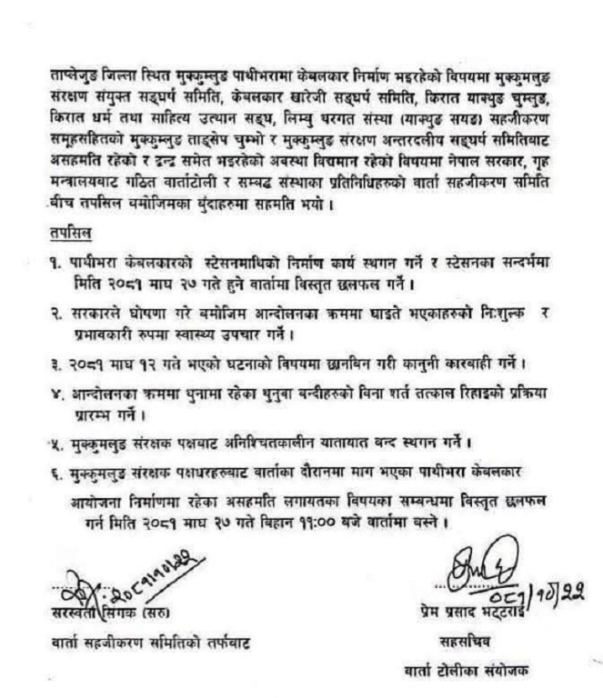 मुक्कुमलुङ संरक्षक पक्षधरबाट वार्तामा माग भएको पाथीभरा केबलकार आयोजना निर्माणमा रहेका असहमतिलगायतका विषयका सम्बन्धमा विस्तृत छलफल गर्न माघ २७ गते वार्ता गर्ने सहमति भएको गृह मन्त्रालयले जानकारी दिएको छ ।
