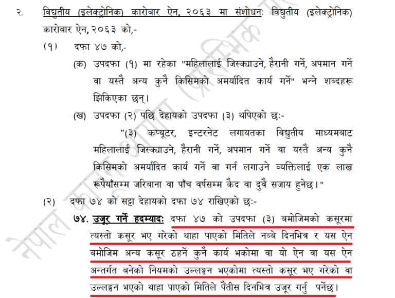 जहाँ भनिएको छ, ‘कम्युटर, इन्टरनेट लगायतका विद्युतीय माध्यमबाट महिलालाई जिस्क्याउने, हैरानी गर्ने, अपमान गर्ने वा यस्तै अन्य कुनै किसिमको अमर्यादित कार्य गर्ने वा गर्न लगाउने व्यक्तिलाई एक लाख रुपैयाँसम्म जरिबाना वा पाँच वर्षसम्म कैद वा दुवै सजाय हुनेछ ।’