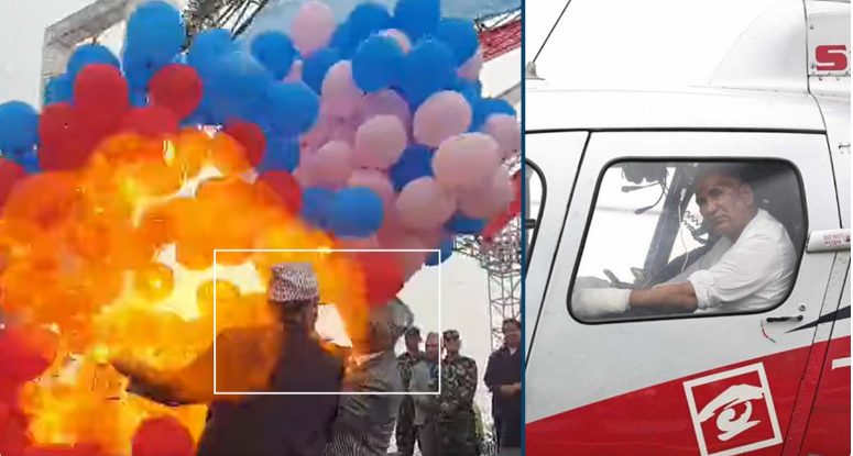 स्पार्क मेसिनले फालिरहेको आगोको झिल्का र त्यसै नजिक नचाइँदै गरिएको हाइड्रोजन बेलुनका झुप्पा । मञ्चभन्दा तल रहेका सहयोगीले मन्त्री पौडेल र मेयर आचार्यलाई अति(प्रज्वलनशील हाइड्रोजन भरिएको बेलुको एक(एक झुप्पा दिए । मन्त्री र मेयर उभिएको मञ्चको दायाँ(बायाँ, अघि,पछि चारैतिर स्पार्क मेसिनले आगो ओकलिरहेको थियो ।