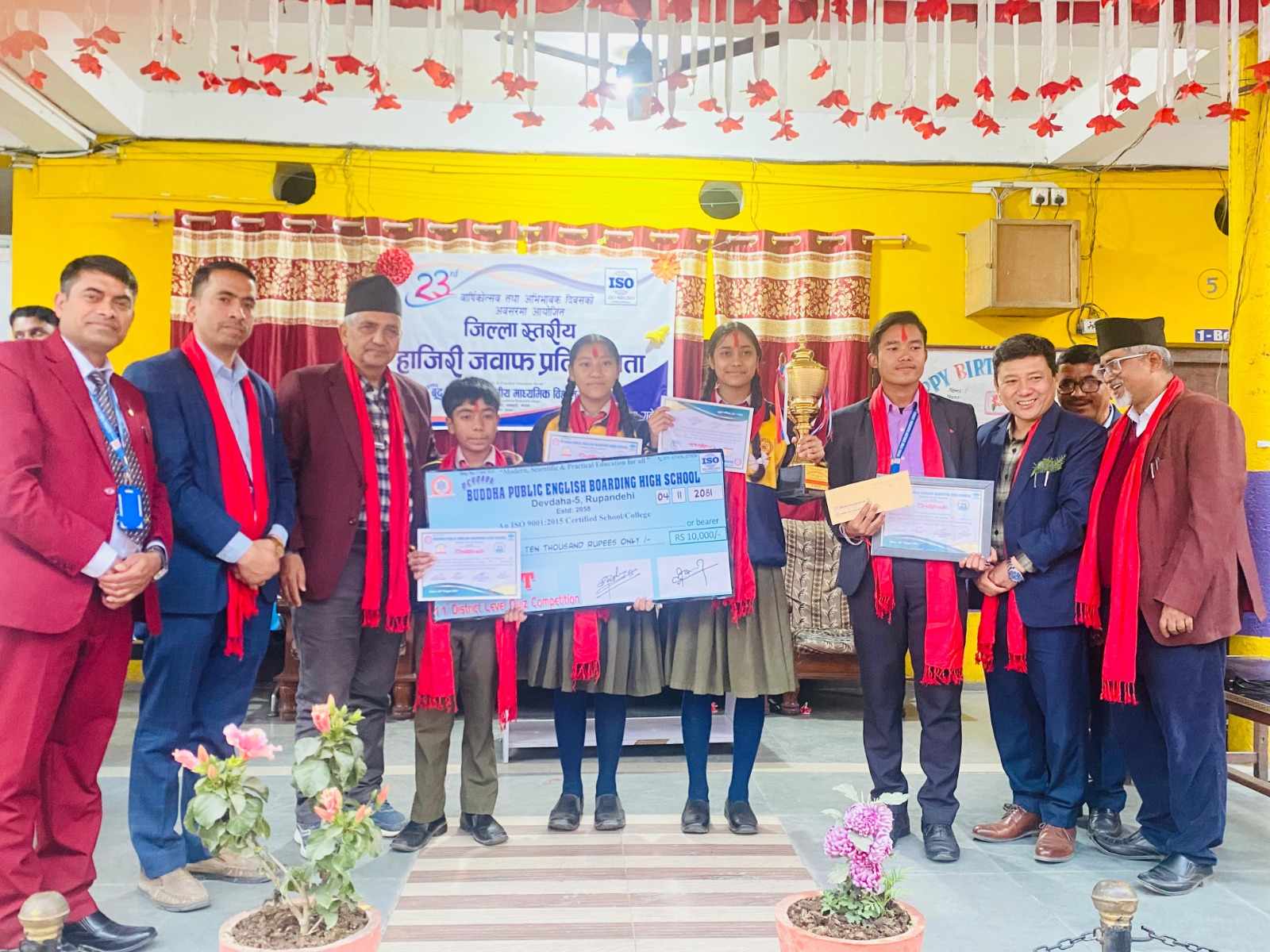 देवदह । रुपन्देहीको देवदहमा जिल्ला स्तरीय हाजिरीजवाफ प्रतियोगिता सम्पन्न भएको छ । देवदह बुद्ध पब्लिक आवासीय माध्यमिक विद्यालयको २३ औं वार्षिकोत्सवको अवसरमा आयोजित प्रतियोगिताको उपाधि सेभेन स्टार ई.बो.स्कुलले जितेको छ ।