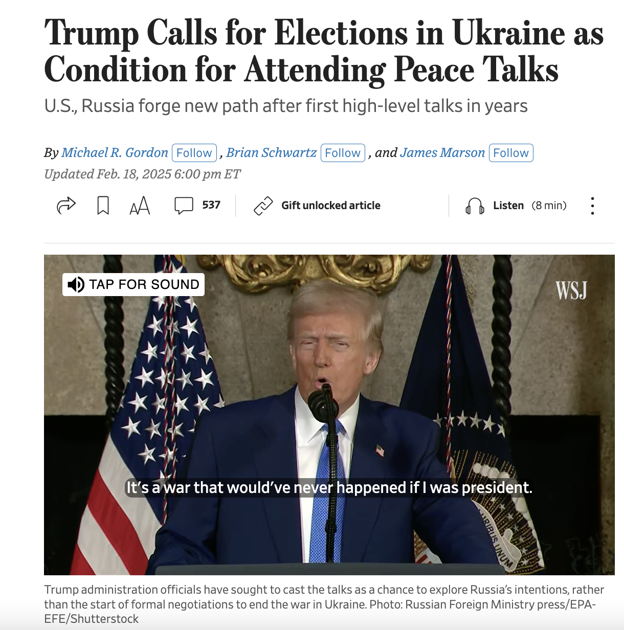 अमेरिकी ट्रम्प प्रशासन निकट मानिने द वाल स्ट्रिट जर्नलले लेखेको छः ट्रम्पले युक्रेनमा चुनावको आह्वान गरे, शान्ति वार्तामा सहभागी हुनको लागि शर्तको रूपमा, अमेरिका र रूसले वर्षौं पछि पहिलो उच्चस्तरीय वार्तापछि नयाँ बाटो खोल्न सके