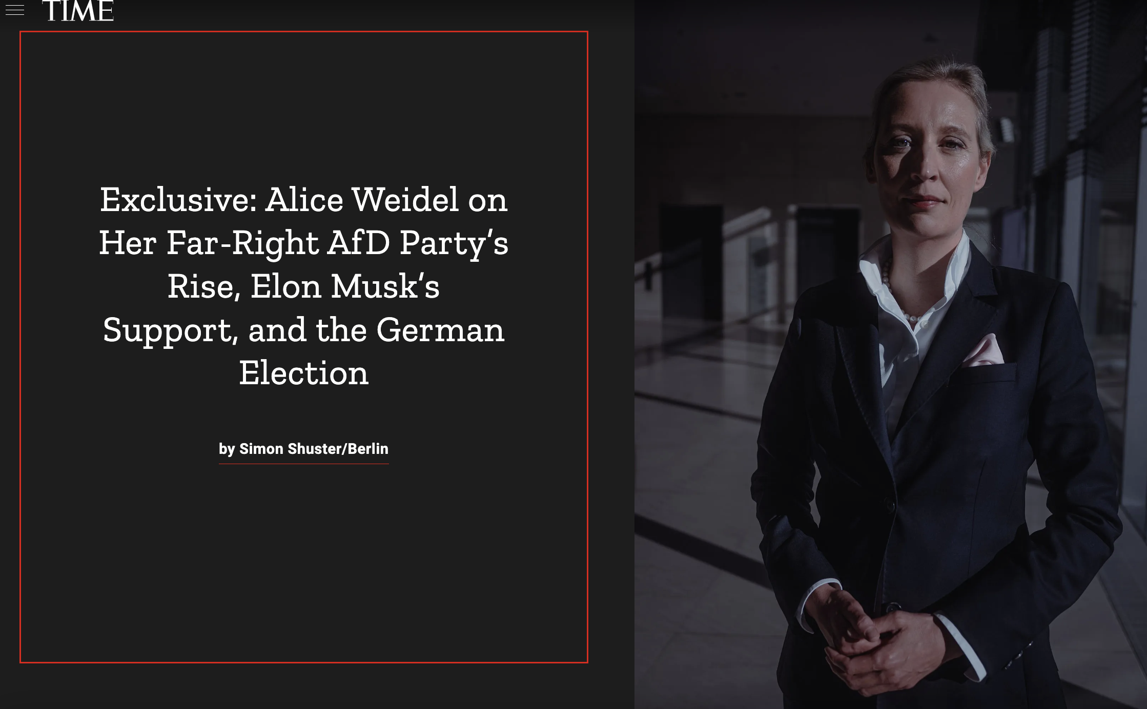 इलोन मस्कको ट्वीट क्रिसमसको केही दिनअघि आयो, र यो जर्मनीको दक्षिणपन्थी राजनीतिक पार्टी, अल्टरनेटिभ फर जर्मनी (एएफडी) का लागि स्वर्गबाट आएको उपहार जस्तो प्रतित भयो । यो मात्र छ शब्दमा थियोः “केवल एएफडीले जर्मनी बचाउन सक्छ।“ पार्टीकी नेतृ एलिस वाइडेलले यो ठट्टा होला भन्ने ठानिन्। आफ्नो फिड रिफ्रेस गरेर उनले सन्देश हेरिन् र स्रोत जाँचिन् २भयिलmगकप। त्यसपछि उनले एक सहयोगीलाई फोन गरेर उनले पनि यो देखे कि कि भनेर सुनिश्चित गरिन्। त्यसपछि, वाइडेल सम्झिन्छिन्, “म वास्तवमा कुर्सीबाट झन्डै लडें।“