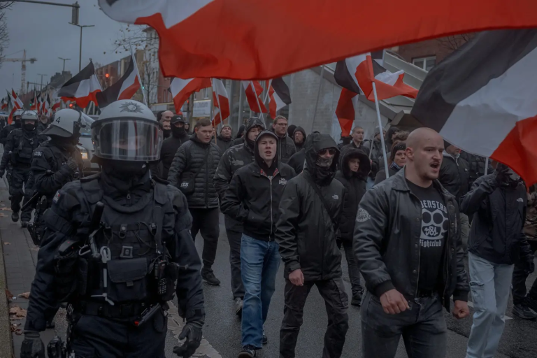 नियो–नाजीहरू डर्टमन्ड, जर्मनीमा प्रहरीविरुद्ध मार्च गर्छन्, डिसेम्बर १४, २०२४।