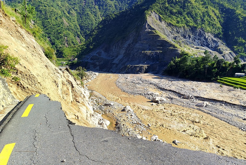 असोज दोस्रो हप्ता बाढी–पहिरोपछि भत्किएको सडक झण्डै दुई हप्तामा अस्थायी डाइभर्सन गरी खोलिएको थियो । यो सडक जोखिमपूर्ण र यात्रा कष्टकर छ ।
