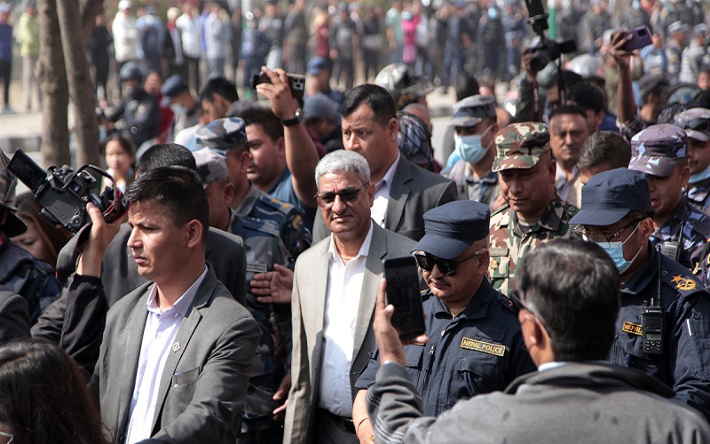 काठमाण्डौको तीनकुने क्षेत्रमा गृहमन्त्री लेखकको अनुगमन : समाजवादी मोर्चाका नेता नेकपा एसको कार्यालय हेर्न पुगे